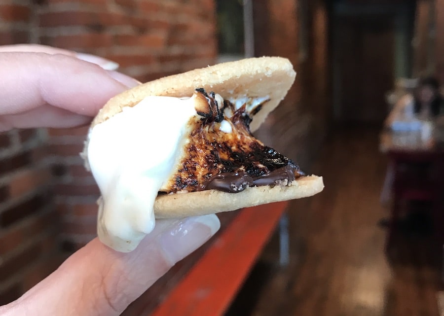 Permettez-moi d’élaborer : Le meilleur genre de S’more, ceux que j’aime le plus, aller un peu quelque chose comme ça — Vous prenez une guimauve rôtie au feu, sandwich qui avec une couche de votre chocolat préféré et puis couvrir tout avec deux morceaux de biscuit graham.