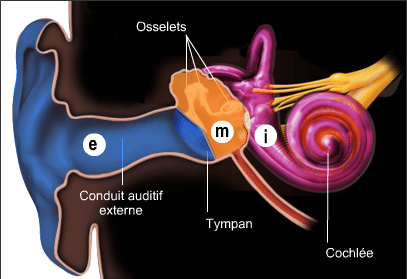 Source Cochléa L’oreille se compose de trois parties. En bleu : l’oreille externe avec le drapeau et le conduit auditif externe. En orange : l’oreille moyenne avec la chaîne des osselets (marteau, enclume et étrier). En rose : l’oreille interne avec la cochléa, en forme d’escargot, et l’appareil vestibulaire, responsable de l’équilibre.Mais alors, ce qui est la surdité ?